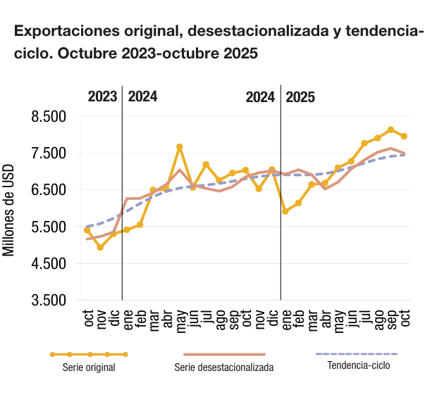 En conclusión el comercio exterior de octubre mostró un desempeño dinámico tanto en exportaciones como en importaciones, en un contexto de mayores cantidades transadas y precios moderados. Aunque el superávit se redujo respecto al año previo, la mejora en los términos del intercambio y el crecimiento del intercambio total reflejan un mayor nivel de actividad comercial. La tendencia-ciclo de ambas series sugiere que el flujo de comercio continúa en expansión, aun con señales mixtas en los datos desestacionalizados.