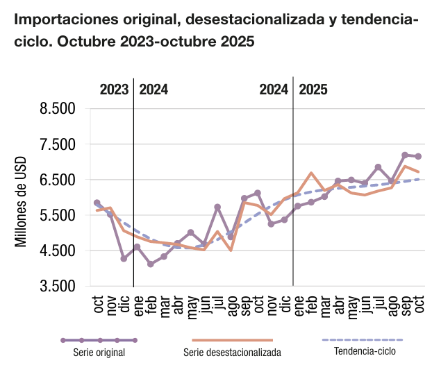 Por su parte, las importaciones totalizaron USD 7.154 millones, lo que implicó un crecimiento interanual del 16,9%. Este desempeño estuvo impulsado por un aumento del 19,7% en las cantidades, compensado parcialmente por una reducción del 2,4% en los precios. En la comparación con septiembre, las importaciones desestacionalizadas cayeron 2,3%, mientras que la tendencia-ciclo registró un avance de 0,9%.