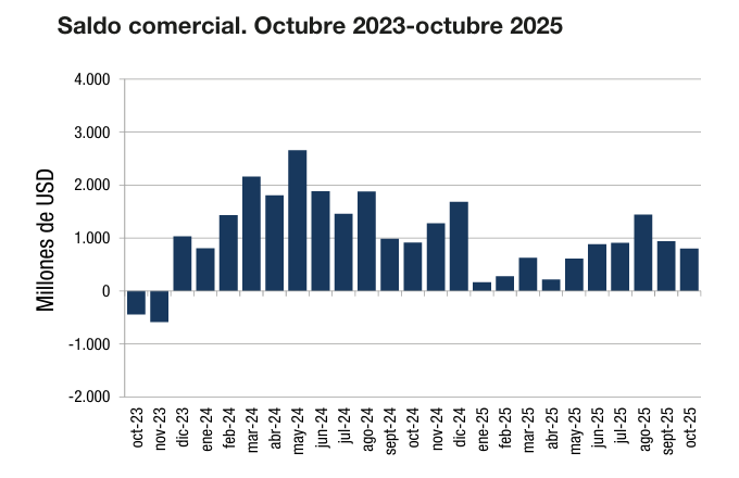 En octubre, la balanza comercial registró un superávit de USD 800 millones, acumulando 23 meses consecutivos de resultados positivos. Sin embargo, este monto implicó una reducción interanual de USD 112 millones respecto de octubre de 2024. El índice de términos del intercambio aumentó 1,7%, señalando una mejora en los precios relativos del comercio exterior. En términos de cantidades, se observó un mayor dinamismo en las importaciones, que crecieron por encima de las exportaciones. El intercambio comercial total (exportaciones más importaciones) ascendió a USD 15.107 millones, lo que representó un incremento de 14,9% interanual.