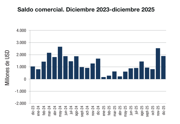 En diciembre, el intercambio comercial aumentó 4,7% en relación con igual mes del año anterior, y alcanzó un monto de USD 13.004 millones. La balanza comercial presentó un superávit de USD 1.892 millones, lo que implicó un incremento de USD 211 millones respecto al mismo mes de 2024. El índice de términos del intercambio disminuyó 0,9%, y reflejó un deterioro en los precios relativos del comercio exterior. En el análisis por cantidades, se destacó el incremento de las exportaciones sobre el de las importaciones.