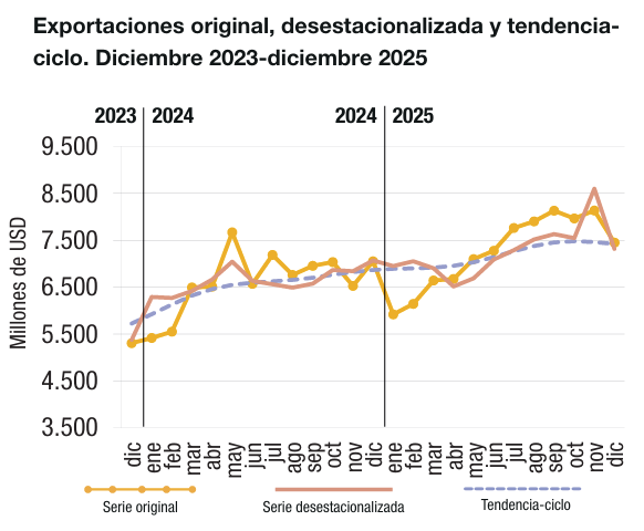Mientras que las importaciones alcanzaron un total de USD 5.556 millones, lo que representó un incremento interanual de 3,5%. Este crecimiento se atribuyó al aumento de 3,0% en las cantidades y de 0,4% en los precios. Los datos desestacionalizados registraron una baja de 2,4% y los de la tendencia-ciclo, 0,3%, en comparación con noviembre de 2025.