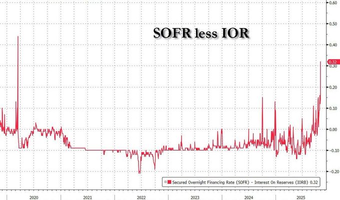El indicador clave que refleja este estrés es el diferencial entre el SOFR (tasa de financiamiento garantizado a un día) y el IORB (tasa que la FED paga a los bancos por sus reservas). Durante la última semana, ese diferencial se disparó hasta +32 puntos básicos, el nivel más alto desde marzo de 2020.