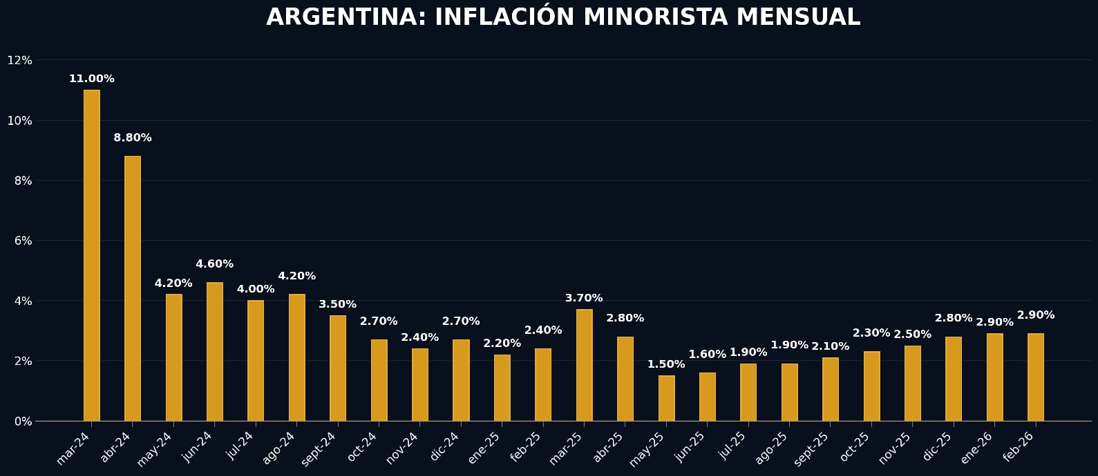 El Nivel general del Índice de precios al consumidor registró un alza mensual de 2,9% en febrero de 2026, y acumuló en el año una variación de 33,1%.