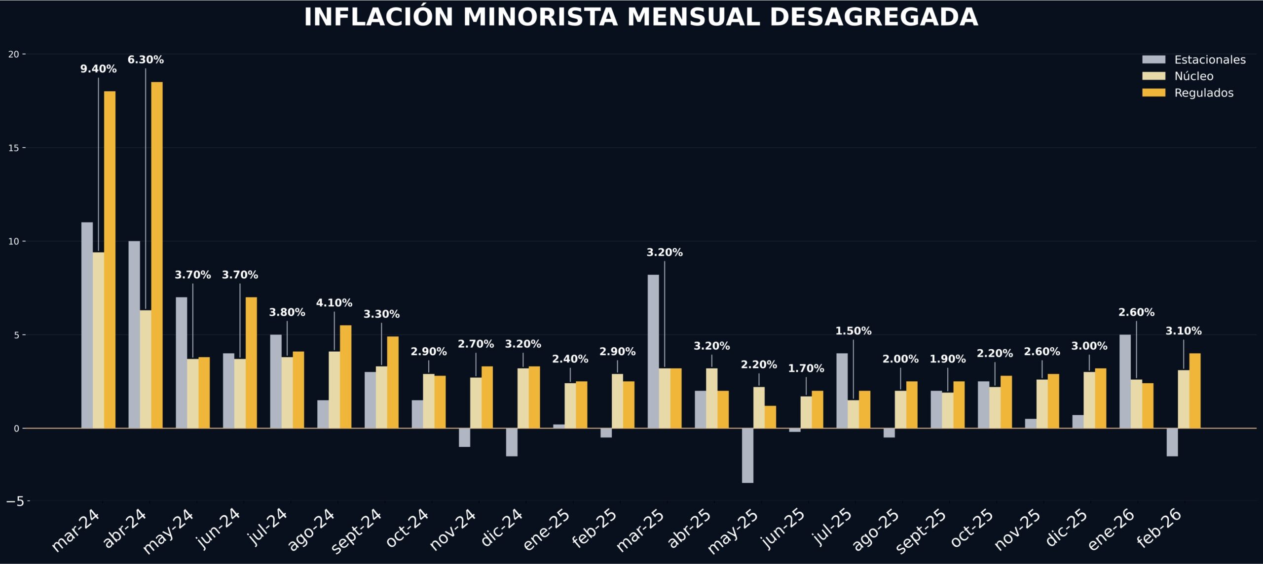 A nivel de las categorías, los precios Regulados (4,3%) tuvieron el mayor incremento, seguidos de IPC núcleo (3,1%) y Estacionales (-1,3%)