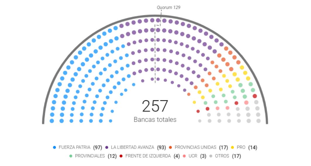 Tras las elecciones, La Libertad Avanza alcanza 93 bancas en Diputados, sumando un crecimiento significativo frente a la composición previa. Junto a Provincias Unidas (17) y PRO (14), el espacio oficialista ampliado reúne 124 escaños, quedando a solo cinco del quórum propio (129).